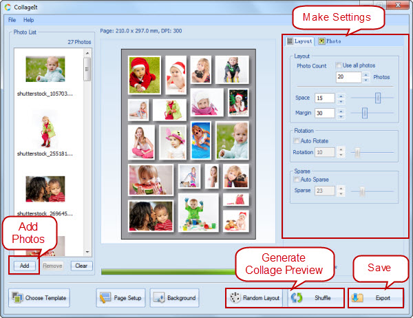 You are going to add photos, click Add button to add desired photos to the Photo List, you can drag the photo to the collage from Photo List directly, and click Random Layout button to generate the new collage layout then the photos will be filled in the collage automatically.