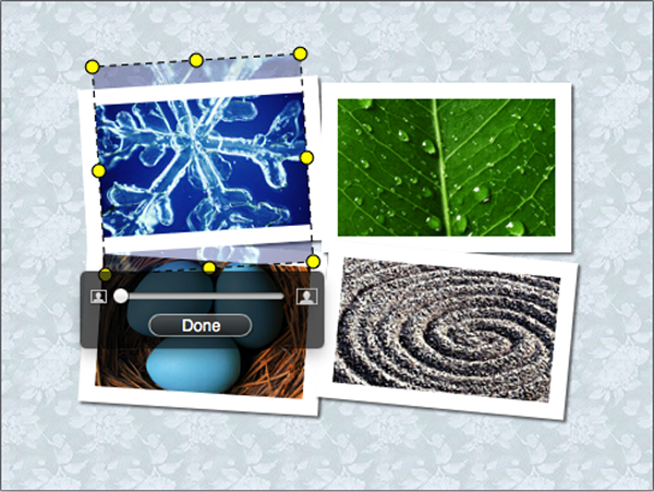 Double click a photo to go into the crop mode; the yellow frame manipulation handles appear.