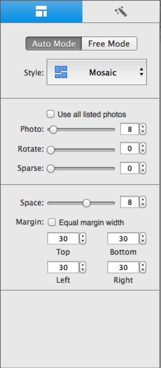 Set various parameters such as Photo, Rotate, Sparse, Space, and Margin to change the layout of collage.You can set the margin on four directions by inputting margin properties of Top, Bottom, Left, and Right respectively.