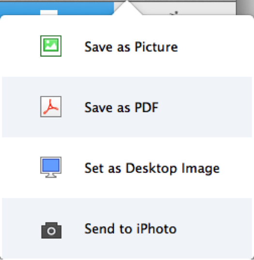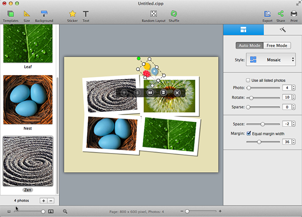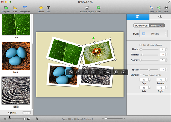 Click Export toolbar button to export your collage as picture/PDF, set as desktop wallpaper, or directly send to iPhoto.