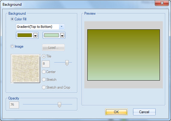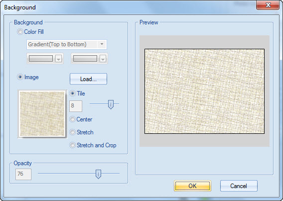 Check Color Fill option, you can use a gradient fill (top to bottom or left to right) or you can use a solid fill. Another way is image fill, check Image option and then load one image that you feel well, the way of image background you can select like Tile, Center, Stretch, Stretch and Crop option.